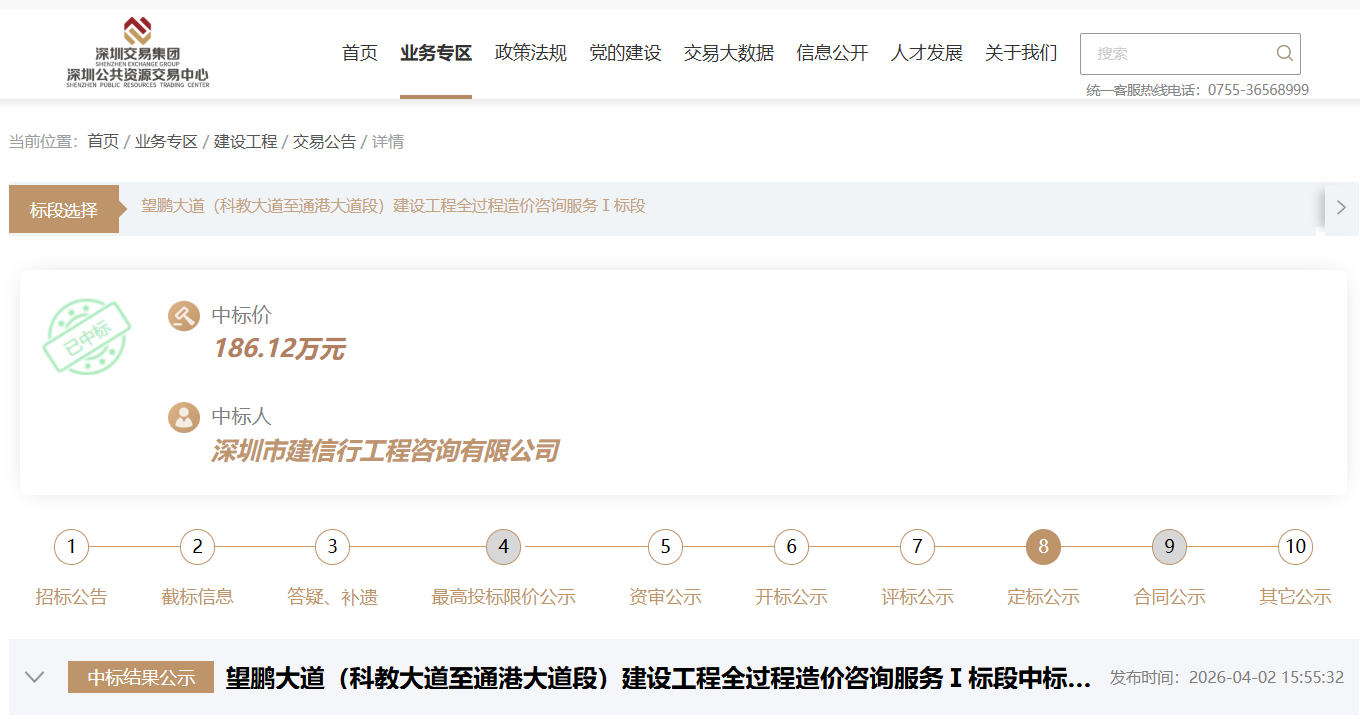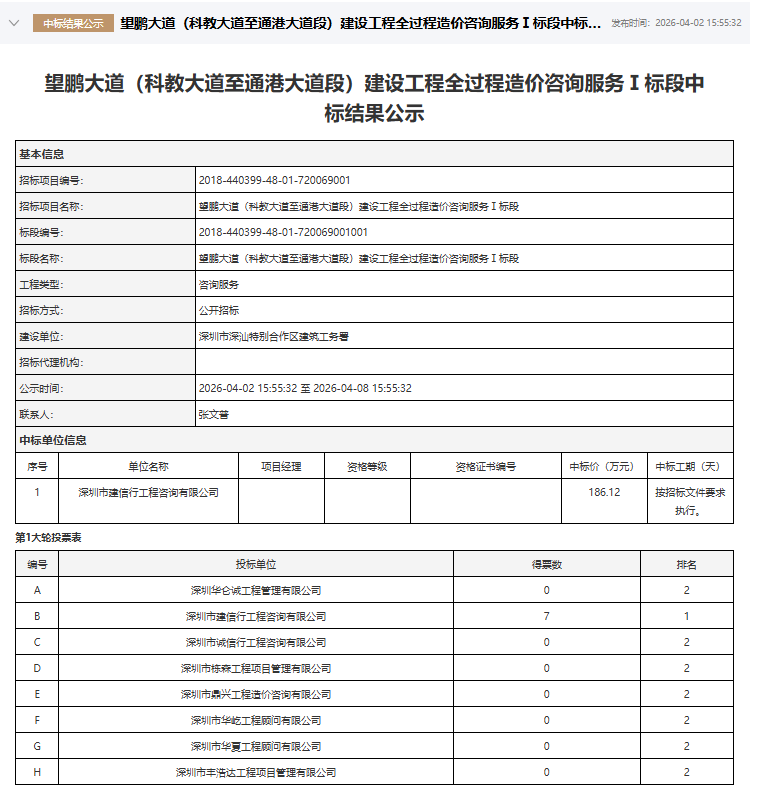 望鹏大道(科教大道至通港大道段)建设工程全过程造价咨询服务Ⅰ标段(全过程造价咨询),建设单位:深圳市深汕特别合作区建筑工务署,中标价186.12万元